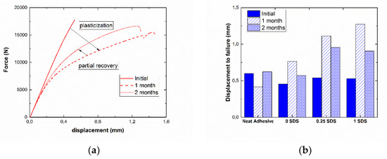 However, in the case of CNT-doped adhesive joints, there are some different mechanisms. Here, the CNT addition itself and the dispersion state, dominated by the surfactant addition, play an important role in the aging mechanisms. As commented previously, a good dispersion implies a high homogeneity of CNT distribution in the matrix, improving the barrier properties. This acts in an opposite way to the amphiphilic behavior of SDS. In addition, the SDS also induces variations in the chemical interactions between the epoxy matrix and the CNTs, leading to a more drastic reduction of the , as shown in Table 2. This was also observed by the displacement at failure shown in Figure 4b. In this case, the higher the SDS content, the higher the displacement at failure was. Moreover, it can be noted that the displacement at failure decreases after 2 months of aging. This was explained by the stiffening effect induced by the secondary crosslinking, which also leads to an embrittlement of the material, as previously stated. Therefore, the combination of the two effects explains the initial reduction of the LSS after 1 month and the general recovery for longer aging times.