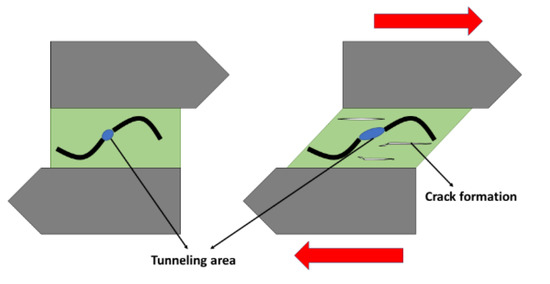 Schematics of electromechanical behavior in a SLS test showing the increase of tunneling distance and crack nucleation inside the adhesive.