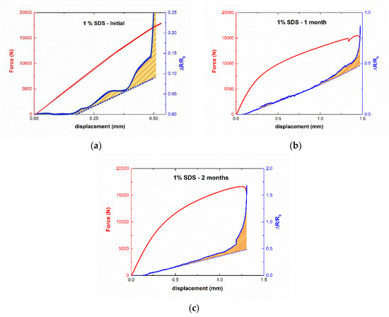 By deeply analyzing the curves for the sample with 1 wt% SDS, the electrical behavior as a function of the applied strain changes was observed from the initial state to the 1-month-aged sample. In the aged sample, softer behavior was observed, due to the plasticization effect. This effect causes a steadier response of the material, with no abrupt changes in the electrical monitoring, as adhesive deformation and crack propagation take place in a softer way. By increasing the aging time, as discussed before, a secondary crosslinking was induced so the effect of plasticization was reduced, showing a mixed behavior between the initial state and the 1-month-aged sample, as noticed in the right graph of Figure 5c, where an abrupt change of the electrical behavior was observed.