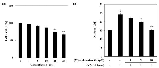 Prior to analysis of the potential UVA protective effects of (2′S)-columbianetin, its cytotoxicity was assessed by an 3-(4,5-dimethylthiazol-2-yl)-2,5-diphenyltetrazolium bromide (MTT) assay in human dermal fibroblast (HDF) cell line. Treatment with varying concentrations (0, 1, 5, 10, 20 and 25 µM) of (2′S)-columbianetin for 48 h showed a dose-dependent cytotoxicity in HDFs with an IC50 value of 93.89 µM (Figure 2A). Cell viability was above 90% up to 10 µM, which was chosen as the highest dose of treatment. UVA irradiation was carried out at 10 J/cm2 dose which was previously reported to be non-toxic for 24 h while inducing photoaging mechanisms (MMP-1 activation and inhibition of collagen synthesis) in HDFs [23]. Ahn et al. [22] reported that (2′S)-columbianetin showed a significant scavenging effect against UVB-mediated reactive oxygen species (ROS) generation in keratinocytes. In the current study, any scavenging effect of (2′S)-columbianetin against UVA-mediated reactive species was investigated in human dermal fibroblasts by measuring nitrate amount in cell culture medium as a marker for reactive nitrogen species (NO) generation. UVA irradiation significantly increased the NO generation in HDFs (Figure 2B). The treatment with (2′S)-columbianetin dose-dependently decreased the UVA-induced NO generation suggesting that it might attenuate the UVA-induced reactive species generation in addition to reported protective effects against UVB.