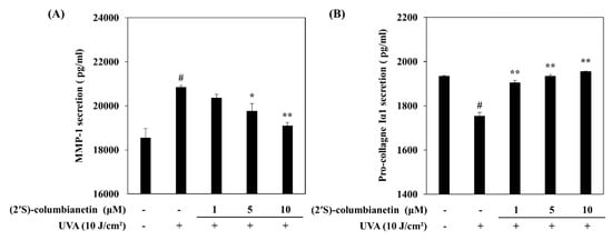 The HDFs were exposed to UVA radiation (10 J/cm2) with or without (2′S)-columbianetin (1, 5, 10 µM) treatment. UVA-exposed cells released substantially increased levels of MMP-1 compared to the non-irradiated group (Figure 3A). The base MMP-1 level in HDF culture medium was 18,550 pg/mL and UVA exposure increased this amount to 20,849 pg/mL. The presence of (2′S)-columbianetin suppressed the UVA-induced increase in MMP-1 levels in a concentration-dependent manner. The MMP-1 levels were reduced to 19,094 pg/mL after the 10 μM (2′S)-columbianetin treatment. The type Iα1 pro-collagen amount in UVA-exposed HDFs was significantly lower than non-irradiated group. The amount of type Iα1 pro-collagen in irradiated HDF culture medium was dropped to 1753 pg/mL from 1934 pg/mL of non-irradiated HDFs. The (2′S)-columbianetin treatment increased the type Iα1 pro-collagen levels in irradiated HDF culture medium. At 10 µM treatment group, type Iα1 pro-collagen amount was raised to 1955 pg/mL.