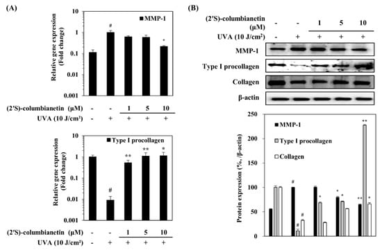 The expression levels of MMP-1 and type I pro-collagen in UVA-irradiated HDFs were analyzed at the gene and protein level. In addition, levels of collagen were also determined. UVA irradiation at a dose of 10 J/cm2 notably increased the mRNA expression of MMP-1 in HDFs while decreasing expression of type I pro-collagen (Figure 4A). Parallel effects were observed in the protein levels of MMP-1 and type I pro-collagen (Figure 4B). However, UVA-induced changes in the MMP-1 and type I pro-collagen were ameliorated by (2′S)-columbianetin treatment in a concentration-dependent manner. UVA exposure resulted in decreased levels of collagen along with its precursor type I pro-collagen (Figure 4B). The collagen level was increased by the presence of (2′S)-columbianetin in a similar fashion to that of type I pro-collagen.