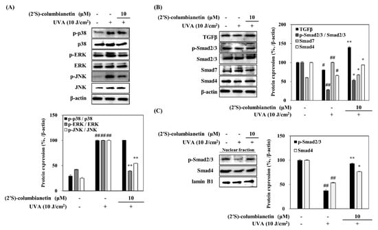 Effect of (2′S)-columbianetin on the protein levels of; total and phosphorylated (p-) p38, ERK and JNK MAPKs (A), TGFβ, Smad2/3 (total and p-), Smad7 and Smad4 (B), and nuclear levels of p-Smad2/3 and Smad4 (C) in UVA irradiated HDFs following 24 h treatment. Protein levels were observed by Western blotting. Bands were quantified densitometrically and shown as relative percentage of UVA-irradiated untreated control group. β-actin and lamin B1 were used as internal loading control. Values are means ± SD (n = 3). # p < 0.05, ## p < 0.01 compared to non-irradiated blank group; * p < 0.05, ** p < 0.01 compared to UVA-irradiated untreated control group.