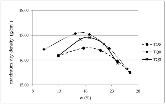 Therefore, the chemical and physical characteristics of the natural soil (i.e., Atterberg’s limits and percentage passing at 0.002 mm) allow it to be classified as the group index A7-6 according to the standard ASTM D3282-15 [31]. Adding quicklime with different percentages (3%, 4%, 5%, and 6%), the particle size distribution and the Atterberg’s limits change: The examined soil can be efficacy-stabilized with quicklime. In order to identify the examined materials, in this study, the treated soils are named TQN, where N is the percentage of added quicklime. Given the obtained Atterberg’s limits, not disclosed herein for the sake of brevity, two percentages by mass of quicklime have been considered in this study: 3% and 5%. Regarding TQ0, the first value is ICL; the second value is LSO. Indeed, 5% by mass of quicklime is the highest percentage that improves WL, WP, and IP over time: 6% of quicklime does not improve the soil parameters compared to 5%. The bearing capacity of the treated soil increases with the percentage of quicklime, and 5% of added quicklime ensures the best mechanical performances. The California bearing ratio (i.e., a penetration test that compares the bearing capacity of the examined material with that of a well-graded crushed stone) [30] is 3% for TQ0, 25% for TQ3, 42% for TQ4, and 58% for TQ5. The opposite trend has been observed for swelling (sw) after 4 d imbibition: sw is 1.3% for TQ0, 0.11% for TQ3, 0.07% for TQ4, and 0.017% for TQ5. According to the modified Proctor test [32], Figure 1 shows the relationship between the achievable dry bulk density and the moisture content (w). The added lime results in flatter compaction curves: The optimum moisture content increases with the stabilizer content and the maximum dry density decreases as the percentage of lime increases: This result complies with the expected effects of the stabilization treatment. Indeed, lime stabilization of fine-grained soils results in a load-bearing capacity increase and swelling and shrinkage potential decrease [33]. Therefore, a stabilized soil has higher strength, lower permeability, and lower compressibility than the native soil.