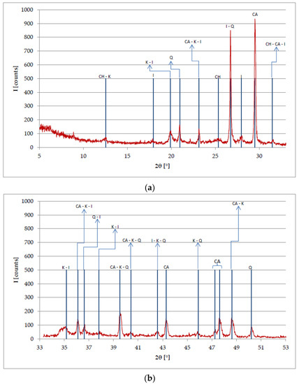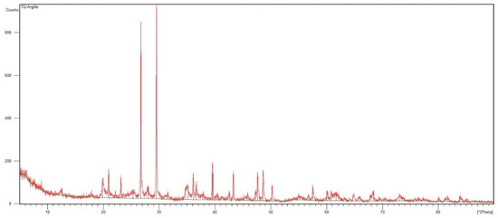The peaks in the diffractogram prove the compositional richness of the specimen [37]. X’Pert HighScore allowed the identification of the main mineral phases: