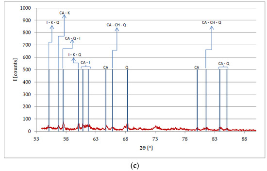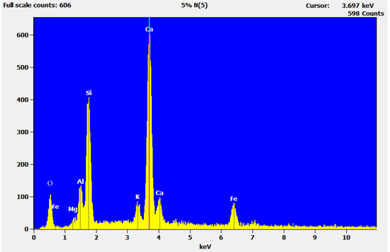 The comparison between spectra in Figure 13 and Figure 14 highlights the reduction of peaks attributable to the clayey fraction (i.e., Al, Si, K). It confirms the diffraction peak intensity reduction observed at 2θ = 26.7273°.
