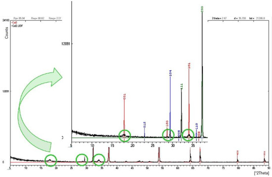 In Figure 4, the XRD pattern of the used quicklime (black curve) is overlaid on that of CaO (red curve). The highest peaks of the used quicklime coincide with those of CaO; however, some peaks are caused by the mineralogical phases of calcite (CaCO3) and calcium hydroxide (Ca(OH)2). In Figure 4, the green circles highlight the differences between the overlaid patterns: The blue ones are related to CaCO3 (2θ equal to 23° and 29°), and the red ones are related to Ca(OH)2 (2θ equal to 18° and 34°).