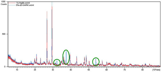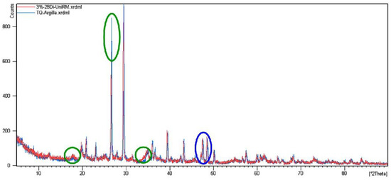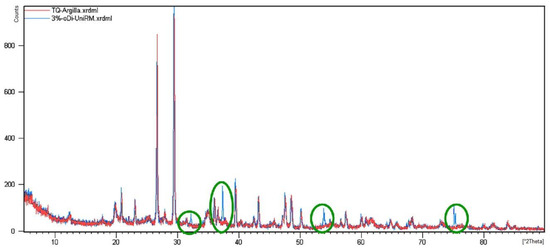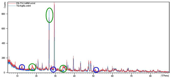 The XRD analysis on the treated soil complies with the procedures exposed for TQ0. During the mellow period, the specimens were in airtight containers at room temperature and away from direct sunlight in order to preserve the state conditions and avoid the quicklime carbonation. Diffraction spectra of TQ3 and TQ5 overlaid on the TQ0 diffractogram are shown in Figure 5 and Figure 6, respectively. In both figures, the XRD pattern of TQ0 is red and those of the treated soils are blue, while the green circles highlight the new peaks, which are related to the added quicklime. The highlighted new peaks demonstrate the effective addition of the treatment agent.