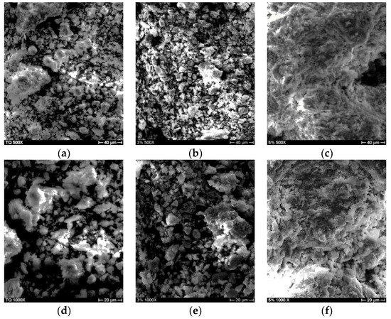 SEM images of (a) TQ0—500X; (b) TQ3 at 28 d mellowing period—500X; (c) TQ5 at 28 d mellowing period—500X; (d) TQ0—1000X; (e) TQ3 at 28 d mellowing period—1000X; (f) TQ5 at 28 d mellowing period—1000X.