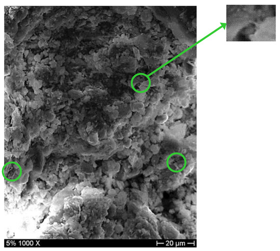 The morphology of TQ0 (Figure 11a,d) is characterized by bound-together grains: The natural soil is composed of agglomerations devoid of hydrate compounds, which could give compactness and strength. TQ3 does not have a very coherent surface (Figure 11b); according to the 1000X magnification (Figure 11e), it presents the formation of agglomerates of larger material, but acicular structures that bind them together are still absent. The morphology of TQ5 (Figure 11c,f) seriously differs from those of the TQ0 and TQ3 SEM images. It appears more compact and uniform than TQ3 and has larger grains: The smaller particles have joined the others over time. The magnification 1000X of TQ5 (Figure 12) shows beginnings of needle-like structures, which join grains one to each other (green circles); the magnified image in Figure 12 shows an acicular structure. It demonstrates the capacity of 5% of CaO to stabilize the examined natural soil.