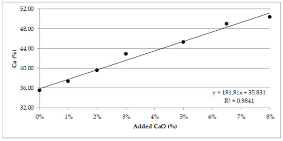 Figure 16 shows the average values of the after-treatment Ca content vs. the added quicklime percentages; the regression linear curve has a coefficient of determination equal to 0.9841.