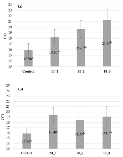 The relative content of chlorophyll in the leaves of maize (CCl) fertilized with utilized foliar (a) and soil fertilizer (b). Ff_1, Ff_2, Ff_3—object with foliar fertilizer applied in doses of 1, 2, and 4 kg ha−1, respectively; Sf_1, Sf_2 and Sf_3—object with soil fertilizer applied in doses of 30, 40, and 60 kg ha−1, respectively.