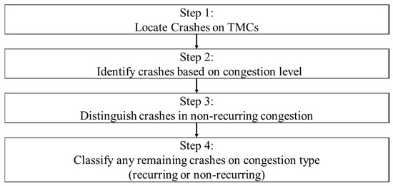 A four-step method is used to add a congestion level indicator to the crash records, as shown in Figure 5. This section provides detailed explanations for each step.