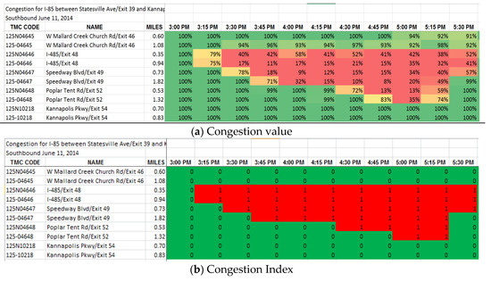 The congestion index, CI(i, t, m), labels each segment i as being congested or uncongested at time t, as illustrated in Figure 2b. The congestion value for each segment is determined. If the congestion value is below a threshold , segment (i) is classified as being congested at time t. Here, a value of 80% was used as the threshold. This value is consistent with the ratio of (the speed at capacity) to (the speed at free flow) presented in the US Highway Capacity Manual [34].
