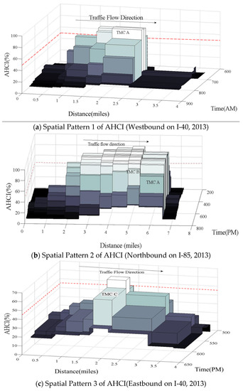 AHCI contour maps are used to define the recurrent bottlenecks as well as their influence areas. To illustrate, Figure 3 shows three different patterns that were observed in Spring and Fall seasons of 2013 in North Carolina. Each block corresponds to an AHCI value at a TMC segment at a certain time of day. A TMC with the highest AHCI (more than 50%) value a given time of day is defined as a recurrent bottleneck segment, , which was proposed from Song et al. [11].