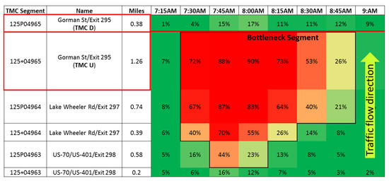 In the study area, the Regional Integrated Transportation Information System (RITIS) provides an integrated spatiotemporal contour map of the traffic congestion for each TMC segment by time of day (RITIS) [33]. RITIS also provides contour maps for comparative speeds, congestion, a travel time index, and so forth. This study used 15 min. aggregated congestion data. RITIS defines the congestion value, C(i,t,m), for segment (i) at time (t). i is TMC a segment and t is specified time interval in a day (e.g., 8:00–8:15, 15 min.) and typically will vary from 1 to 96 for a single day. m is index for a day in the study period especially for weekday. Finally, MS(i, t, m), the measured speed (mi/h), and FFS(i) the free flow speed (mi/h) are specified for each segment.