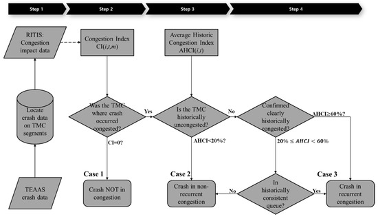 The second step is to identify the crashes which occur during uncongested conditions. As shown in Figure 5, if the crash occurs on a TMC segment that is uncongested at the time of the crash, then the crash is labeled as “Case 1—Crash not in congested conditions”. Otherwise, the analysis continues to Step 3. As mentioned earlier, if CI(i,t,m) = 0, then TMC segment i is considered to be uncongested at time t and vice versa.