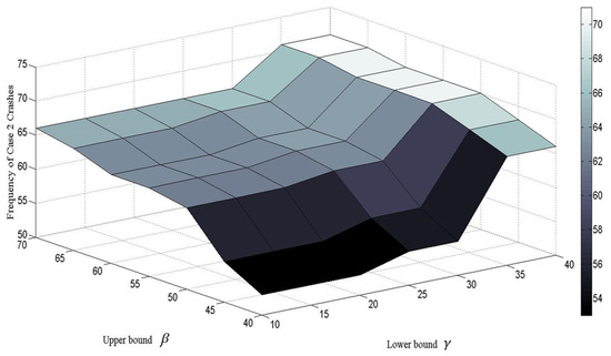 The values of and are determined through a sensitivity analysis. Figure 6 shows the sensitivity the sensitivity analysis for crashes labeled as “Case 2—Crash in non-recurrent congestion”. It is clear that if the upper bound is between 50 and 70 and the lower bound is between 10 and 20, the number of Case 2 selections becomes quite stable. However, if the upper bound drops below 50 or the lower bound is increased beyond 30, the number of Case 2 classifications changes significantly. This leads to the conclusion that the upper and lower bounds used in the selection process presented above are a good combination to employ. A value of 60% as the threshold of and 20% for . The values of and were 20% and 60%, respectively. Therefore, if AHCI(t), then TMC segment i is congested at time t less than once in every five days. If AHCI(t), then it is congested at least every other day. Therefore, if AHCI(t) , then the crash is labeled as “Case 2”. Otherwise, it is passed to Step 4.