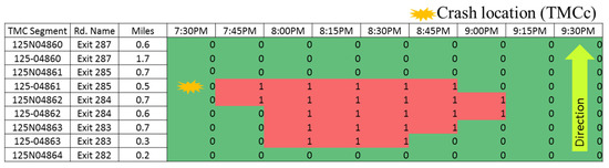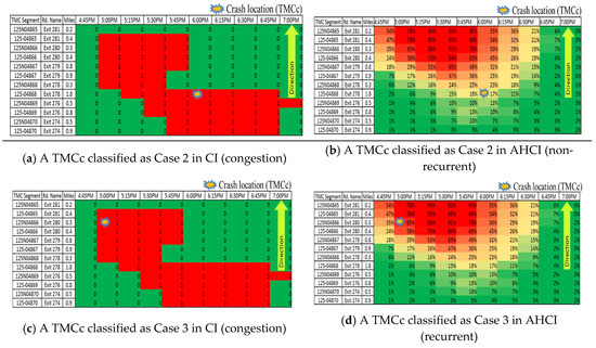 In Step 3, the remaining 81 crashes were further analyzed. Of them, 62 were classified as belonging to Case 2 (a Case 2 is one that occurs in non-recurrent congestion). Panels (a) and (b) of Figure 8 show a crash that was identified as belonging to Case 2.