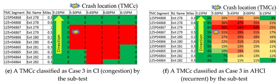 Examples of TMCc classified as Cases 2 and 3 in Steps 3 and 4: (a) A TMCc classified as Case 2 in CI (congestion); (b) A TMCc classified as Case 2 in AHCI (non-recurrent); (c) A TMCc classified as Case 3 in CI (congestion); (d) A TMCc classified as Case 3 in AHCI (recurrent); (e) A TMCc classified as Case 3 in CI (congestion) by the sub-test; (f) A TMCc classified as Case 3 in AHCI (recurrent) by the sub-test.