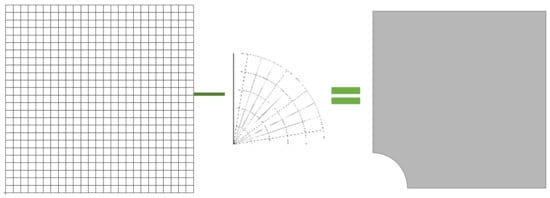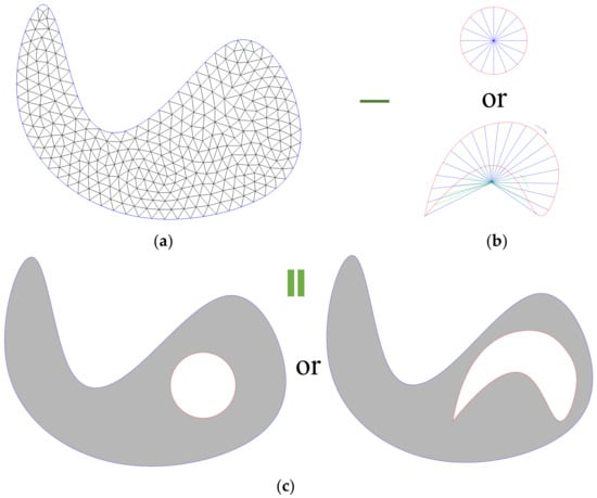 The method we present here is the application of an integration subtraction technique to the meshfree method. The meshfree radial point interpolation method (RPIM) is chosen for its quick implementation. In the integration subtraction technique, the predesigned domain can be meshed as an initial integration background cell using one of many methods, while the awaiting designed hole is meshed using a homotopic method (such as the discretization idea in the scaled boundary method []) and subtracted from the initial integration background (short for RSUB), as illustrated in Figure 1. Unlike the scaling requirement in SBEM, there are no limitations for the shape of hole, which means convex and concave holes are all available, as the concave part would be cancelled out in the circle subtract integration process of the hole. Therefore, when the problems are expanded from two dimension to three dimension, the mesh for holes can still be easily generated, and no local refinement is needed with this homotopic meshing strategy. With this subtraction technique, the trimming curve used in CAD models to describe arbitrary topology can be directly applied in analysis procedures. As the integration of the new hole is calculated, the relevant part of the stiffness matrix can be directly subtracted from the global one to construct the new stiffness matrix with no change in size. Then, if the hole is changing, a more efficient moving subtraction technique (short for RMOV) is developed in which only the changing integration part between the old and new boundaries of the hole needs to be recalculated and subtracted. This will be discussed in detail later in Section 3.2.5.