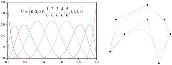 The ability of NURBS curves to efficiently describe arbitrary free-form shapes and all kinds of conic sections exactly has made NURBS the basis for all standard geometric exchange formats, e.g., Initial Graphics Exchange Specification (IGES) and Standard for the Exchange of Product Model Data (STEP) []. NURBS is the general form of the B-spline and is actually a linear combination of B-spline basis functions. B-Spline basic functions are defined over a parametric domain that is constructed by a so-called knot vector. A knot vector is defined as: