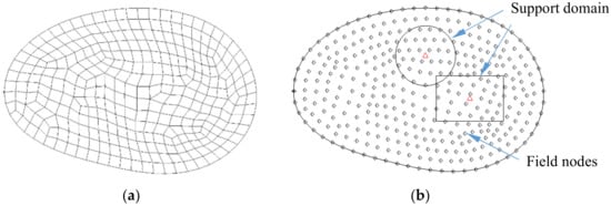 As shown in Figure 3, the approximation function of unknowns in the meshfree method is constructed by scattered nodes, which are called field nodes. Thus, the information for approximation has been separated from the integration cells, which means that the mesh quality associated with approximation has been weakened, thereby giving us more freedom in discretizing the material domain.