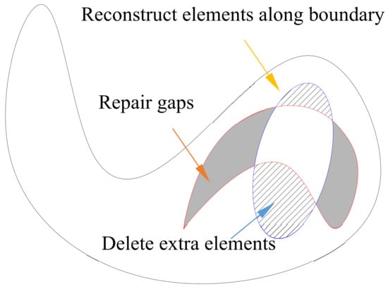 In the NURBS-enhanced meshfree method, NURBS is used to describe the shape of the boundary and construct the background integration meshes as the foundation. As a result of the low requirement for integration mesh quality in the meshfree method, hybrid triangle elements can be chosen to accomplish an easy mesh for complex topology within the boundaries, as in Figure 4a. The integration elements and quadrature points are shown in Figure 4b. The integration points for the interior elements are generated with standard Gaussian quadrature rules. For the boundary elements, NURBS mapping quadrature rules for curved elements, such as the rules for high-order curved elements and NEFEM [], are used. Even if the hybrid triangle mesh is relatively easy to implement, it is still time consuming to reconstruct the meshes and the stiffness matrix when the inner boundary is changed or a new hole is added. An alternative way to obtain the new stiffness matrix is to partially correct by refinement, but the measurement involved in deleting extra elements, repairing the gaps, reconstructing elements along the new boundary and redistributing nodes in the refinement region is relatively complex, as shown in Figure 5. Therefore, we recommend a subtraction technique in the integration process to avoid the complex measurement required for dealing with the nodes and elements in the refinement process, as illustrated in Figure 1.
