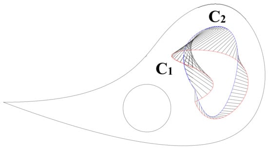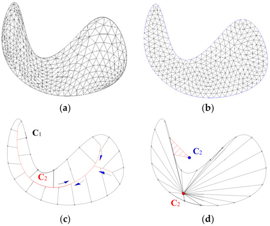 Homotopic meshing in 2D means the process of mapping the boundary curve to the inner curve . Both and are closed NURBS curves, and the arrows in Figure 6c show the circumferential direction of . Then, the physical locations of any points within can be expressed as a function of the circumferential parameter u and radial parameter v by: