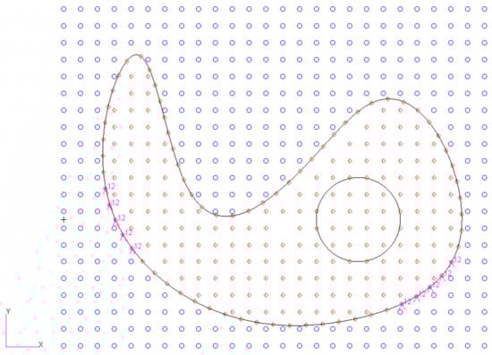 where R is the Euclidean distance between the field node and the point on the boundary. Zero is just an ideal number to reach in the numerical solution, therefore we define any node with a result less than to be outside. Finally, the remaining nodes are deployed along the boundary of the predesigned domain, as shown in Figure 7, in which purple labels of “12” means the fixed boundary condition in X and Y directions.
