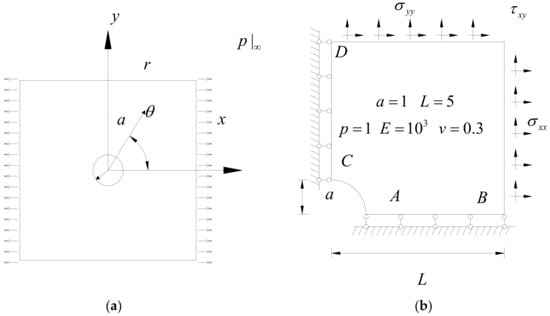 The first example is an infinite plate with a circular hole in the center, subjected to a unidirectional tensile load of p = 1.0 in the x-direction, as shown in Figure 9a. Due to symmetry, only one quadrant of the plate is modeled in Figure 9b. The geometry and material properties are as follows: length , hole radius , Young’s modulus , Poisson’s ratio . The symmetry conditions along CD and along AB are imposed on the left and bottom edges, respectively. Traction boundary conditions given by the exact solution are imposed on the right (x = 5) and top (y = 5) edges.