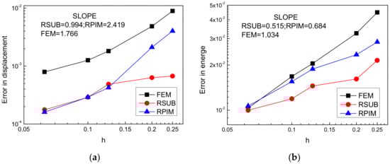 In Figure 12, the two meshfree methods, RPIM and RSUB, demonstrate higher accuracy than FEM in displacement and energy, with RSUB appearing to be the most accurate among the three tested methods. The better accuracy of RSUB with coarse mesh may be obtained by the duplicate integration for subtraction, which may be able to improve the result around the boundary of hole. When the node interval gets smaller, this advantage in precision of RSUB becomes less significant and converges to RPIM. In addition to having greater displacement accuracy, RPIM has higher convergence rates. Moreover, the presented RSUB method achieves extremely high accuracy on a rough mesh. However, with respect to energy, the convergence processes of RPIM and RSUB are not good, although their accuracy is better than that of FEM. It has been shown by Liu and Gu [] that a purely MQ-RBF cannot always ensure to exactly reproduce a linear field function. This could be one of the major reasons for the poor h-convergence in using MQ-RBF for field variable interpolations.