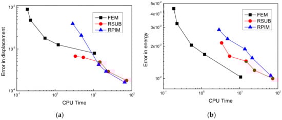 As a result of the shortcomings of the MQ-RBF, its energy efficiency is still not satisfactory. However, with regard to displacement, the meshfree methods, RPIM and RSUB, achieve better efficiency than FEM, as shown in Figure 13. While RSUB seems to be a little more time consuming than RPIM, the duplicate integration in the hole region for subtraction yields greater accuracy. Thus, RSUB is actually more efficient than RPIM.