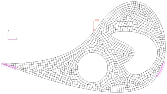 As the problem of a single circular hole dug in the predesigned domain of a rectangle has been verified above, we now propose another example of an arbitrary domain: a bubble with arbitrary holes. In FEM, this bubble is discretized with an edge length of 0.03 with paver quad4 meshes, as illustrated in Figure 15. The material properties and constraints are as follows: Young’s modulus , Poisson’s ratio , the left and right side of the bubble are fixed in X and Y directions (shown with purple labels “12” in Figure 15), and a single force of 1.0 is applied to the upper side. As for the presented method, the predesigned domain and holes are all discretized in a point-style homotopic mesh, with numbers in the circumferential direction and numbers in the radial direction, as marked in Figure 16. Field nodes are deployed at a uniform interval of 0.04 within the predesigned domain with the same nodes as FEM along the boundary, as shown in Figure 16c.