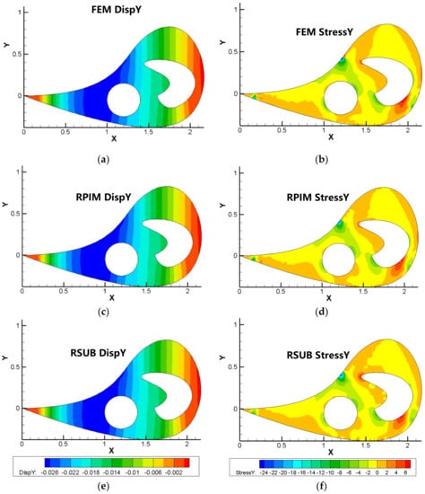 Displacement in y-direction of different methods: (a) FEM; (c) RPIM; (e) RSUB. Stress in y-direction of different methods: (b) FEM; (d) RPIM; (f) RSUB.