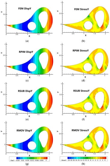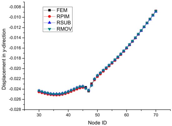 The moving subtraction technique, which has been discussed in Section 3.2.5, is called RMOV for brevity. The shadow line in Figure 19b shows the discretization in the circumferential direction. The material property and constraints, the parameters of the point-style homotopic meshes of the circle hole, and the outer boundary remain unchanged. Then, the results of displacement and stress in the y-direction are compared among the four methods of FEM, RPIM, RSUB, and RMOV in Figure 20. The detailed displacement in the y-direction near the force is plotted in Figure 21.