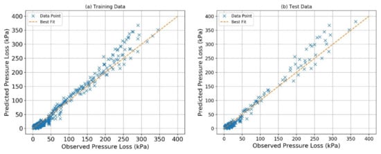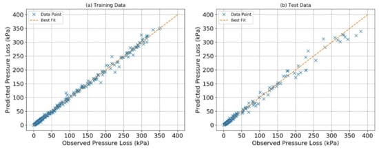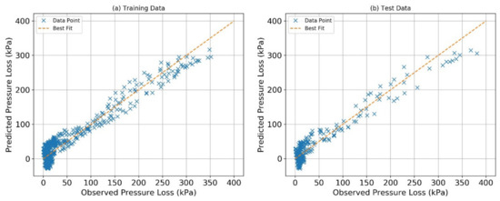 Artificial neural network (ANN) predicted pressure plotted with observed pressure loss: (a) training dataset and (b) test dataset.