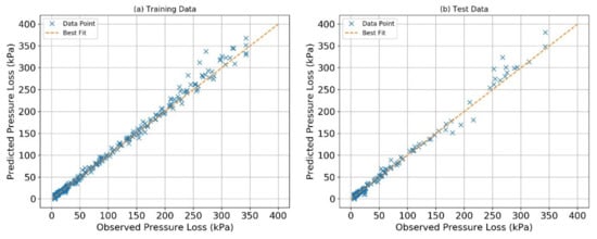 BNN predicted pressure plotted with observed pressure loss: (a) training dataset and (b) test dataset.