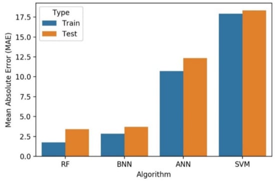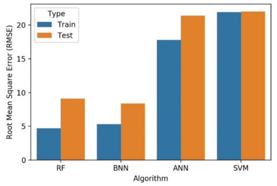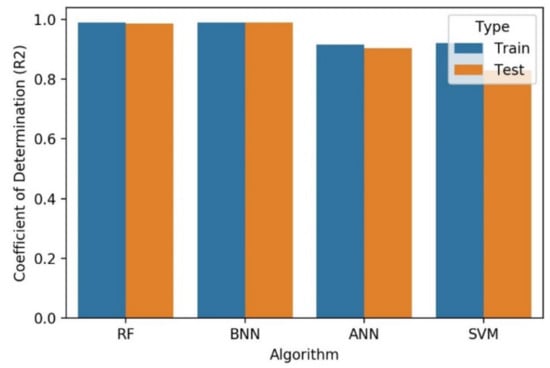 The performance of the proposed algorithms is summarized in Table 4 based on the metrics, such as RMSE, MAE, and R2 for the training and test dataset. RMSE is plotted in Figure 8 for different algorithms. It is observed that RF and BNN performance on test and train data is very similar and lowest. Both methods surpass the RMSE score for ANN followed by SVM. MAE score is plotted in Figure 9 with different algorithms. It is found that the performance of the BNN and RF is similar and lowest in comparison to ANN and SVM, while RF maintains a marginal accuracy than BNN. The R2 plot is also analyzed (shown in Figure 10) with different algorithms and it is found that the test and train datasets are very concise and clear. The accuracy of RF and BNN are close to 1, whereas, it is near 0.9 for both ANN and SVM.