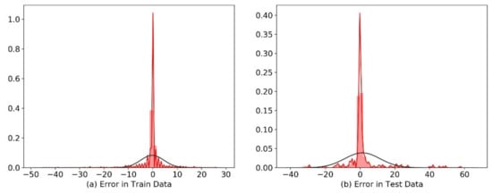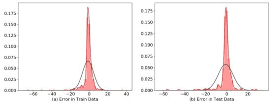 Distribution of error for train and test dataset, Random Forest. Black outline denotes the theoretical normal distribution and the red color represents the distribution of the residual error.