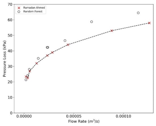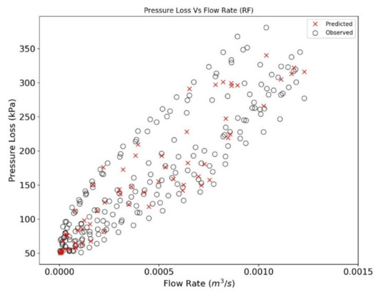 Observed and predicted pressure loss is plotted with flow rate for RF algorithm for high pressure regime.
