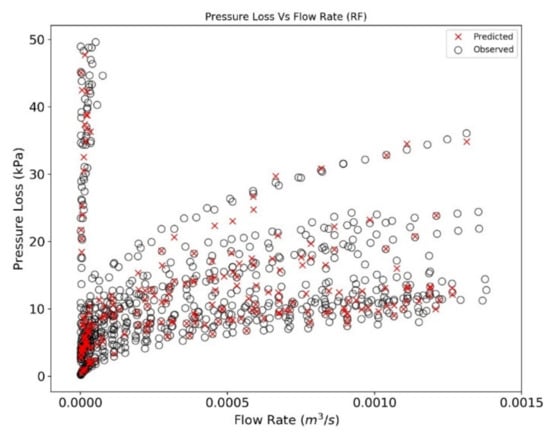 Observed and predicted pressure loss is plotted with flow rate for RF algorithm for low pressure regime.