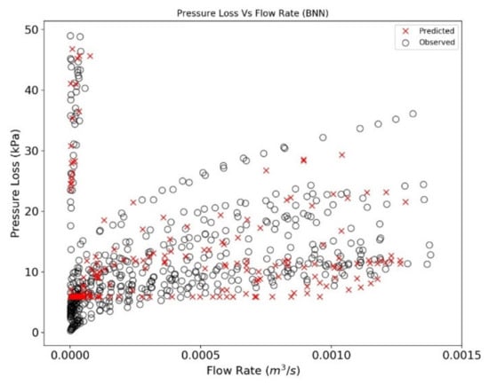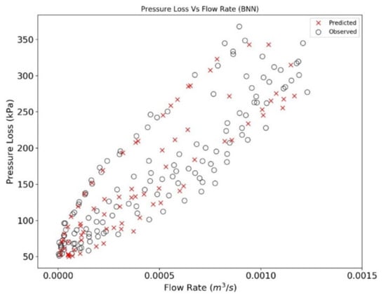 Observed and predicted pressure loss is plotted with flow rate for BNN algorithm for high pressure regime.