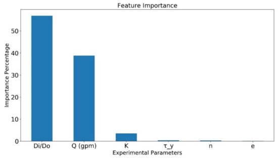 RF is an ensemble model, where multiple decision trees are created based on randomly sampled datasets to approximate and lower the error. The model also quantifies the contribution of each input parameter towards predicting output. Subsequently, this property can be used to determine the importance of each input parameter to predict the desired output. The percentage-wise bar plot is shown in Figure 19 for each input parameter that have effect on the predicted output values. The diameter ratio (Di/Do) is the highest dominating parameter with contribution of approximately 58% out of the six-input followed by flow rate m3/s i.e., 37%. The diameter ratio and flow rate account for 95% dominance in predicting the pressure loss, while the Herschel–Bulkley fluid parameters has low accountability of remaining 5% where the consistency Index (K) has a share of 3.5% while flow index and shear stress have less than 1% contribution and eccentricity has negligible effect of the pressure loss.