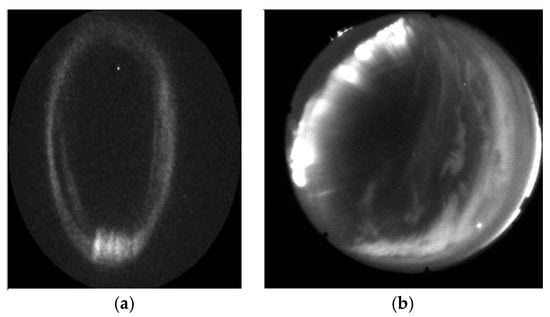 The aurora observation methods can be mainly divided into two categories. One is the ground-based observation system composed of all-sky imagers (ASI), and the other is the space borne observation system represented by the ultraviolet imager (UVI). At first, the ASI was used to monitor the local auroral structure. During the international geophysical year (IGY) (1957–1958), space scientists all around the world coordinated their efforts to record the aurora from many places at the same time. Using the data from the IGY-ASI, Shun-Ichi Akasofu, was one of the first to understand that the global aurora in the North was an oval of light surrounding the north magnetic pole: the auroral oval []. With the development of the aerospace technology, space scientists are able to observe the aurora through the UVI cameras aboard the spacecraft. The aurora images captured by these two instruments are shown in Figure 1. Different from the ground-based observation, auroral images captured by UVI instruments in the space mainly focus on providing global information, e.g., the overall configuration of the aurora and the spatial distribution of the auroral intensity [,]