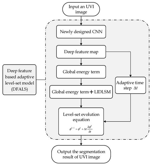 The flow diagram of our work is shown in Figure 2. First, the CNN designed in our work is trained on the training samples extracted from the UVI image data set. Following this, the global energy term and adaptive time step are devised based on the confidence value obtained from trained CNN. Subsequently, the global energy term and adaptive time-step are introduced into the LIDLSM for the extraction of the auroral oval. Experiments performed on the UVI image data sets demonstrate that the proposed method, compared with the state-of-the-art algorithms, can obtain more accurate segmentation results and is more robust to different contour initializations.
