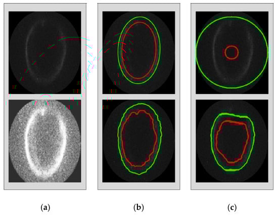 The first term of Equation (1) is the product of the improved SPF () and the balloon force (). The improved SPF function has values in the range . It modulates the signs of the pressure force inside and outside the region of interest so that the contour shrinks when outside the object, or expands when inside the object []. The second term is the level set evolution function corresponding to the LIF model, where and denote the mean grayscale intensity of and , respectively. is the local fitted image and is the univariate Dirac function. By utilizing the local image information, the LIF model is able to segment images with intensity inhomogeneity []. The weight coefficient is used to adjust the weight between the SPF function and the LIF model. Based on global and local image information, inhomogeneous images can be segmented quickly and accurately by SPFLIF-IS.