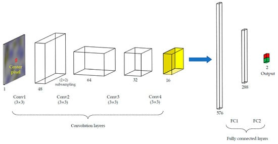In deep learning, CNNs are the most popular networks used for image classification. In this work, CNN is utilized to obtain the confidence value of each pixel belonging to the auroral oval region. The design of the proposed CNN architecture is motivated by [], and the structure is shown in Figure 5. This network consists of an input layer, four convolution layers, and two fully connected layers. The input layer specifies a sub-image extracted from the auroral images with the size of 11 × 11. Each convolutional layer has a 3 × 3 filter and a rectified linear unit (ReLU) [], and zeros are padded around the border before each convolution so that the output does not lose relative pixel position information. The feature map (yellow) after the fourth convolutional layer is reduced to a one-channel feature as a 1 × 576 vector. The output of the network is a 1 × 2 vector which indicates the confidence values that the center pixel belongs to the auroral region (red) and background region (green).