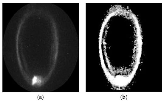 The data set includes 200 auroral oval images which were captured by ultraviolet imager (UVI) aboard on National Aeronautics and Space Administration (NASA) Polar satellite on 10 January 1997, 31 July 1997, 15 January 1998, and 25 January 1998. The Polar satellite was launched in February 1996 into a highly elliptical orbit of 2 × 9 (Earth radius) with 86° inclination, and it views the north polar region for about 9 hours out of every 18-hour orbit []. Auroral oval images used in this study were obtained using the Lyman–Birge–Hopfield ‘‘long’’ (LBHL) filter of the UVI on the Polar satellite, and the auroral radiance in this wavelength band originates from (Nitrogen molecules) emissions at altitudes of ~120 km []. The corresponding benchmark images which show the auroral oval region were annotated and cross-verified by several aurora experts manually. An example of the auroral oval image and the corresponding benchmark image is shown in Figure 8.
