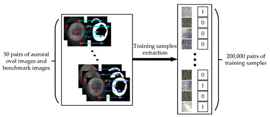 Among the UVI images, 50 typical images are used to extract training samples for CNN, and the rest 150 images are used as test images for the validation of the proposed method. As abovementioned, 45,600 sub-images with the size of 11 × 11 can be obtained from each UVI image, in which 4000 sub-images are used for training CNN. Therefore, there are 200,000 (4000 × 50) sub-images are selected as training samples for CNN. The process of training samples extraction is shown in Figure 9. In the first step, 2000 auroral oval pixels and 2000 background pixels are selected randomly from each image. In the second step, centered on these pixels, sub-images with the size of 11 × 11 are available. In the third step, the center pixels’ values in the benchmark image are taken as the labels of the corresponding sub-images. With the 200,000 training samples, the prediction accuracy reaches 93.2% when the CNN was trained for 50,000 epochs.